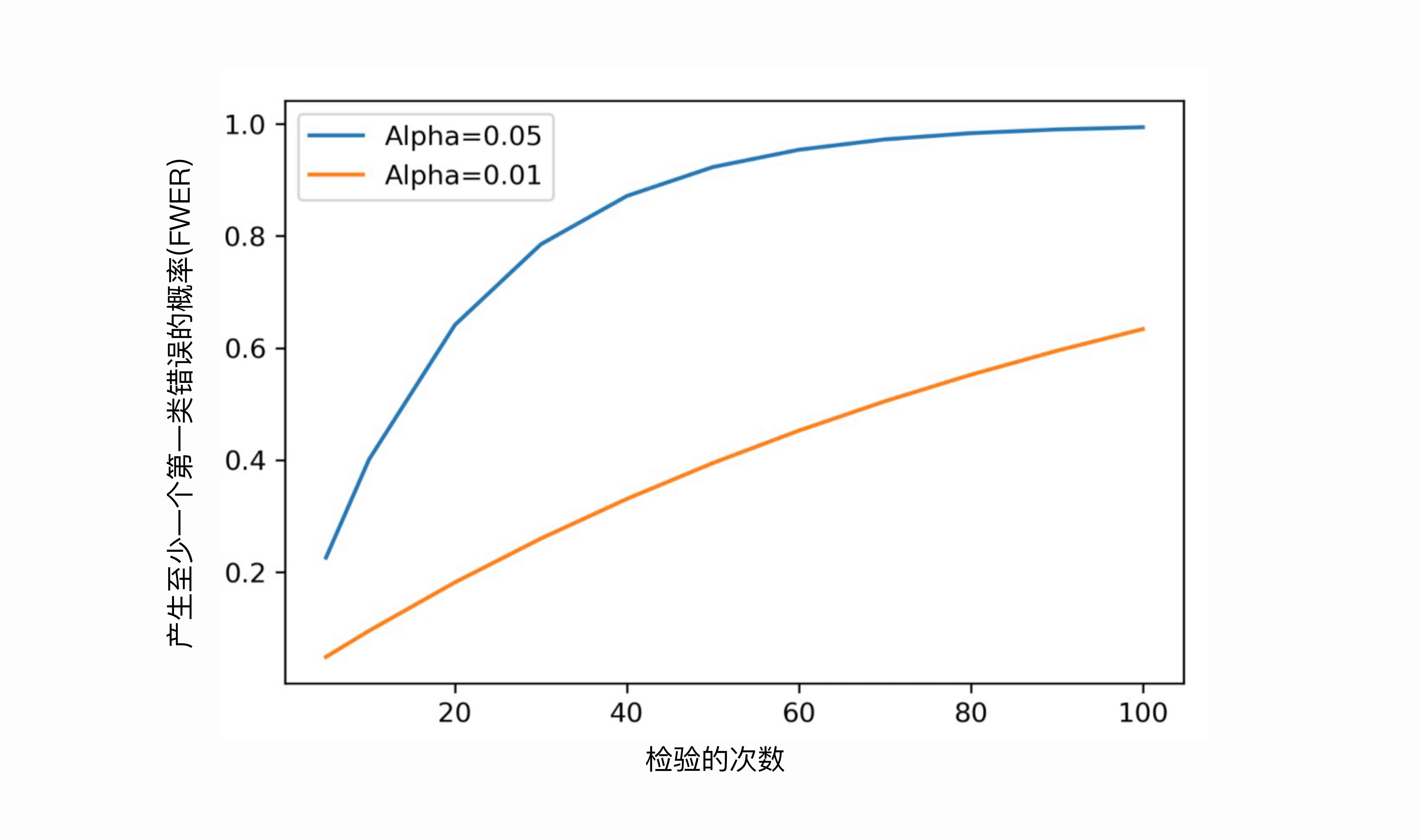 随着检验次数的增加,FWER,也就是出现第一类错误的概率会显著升高。