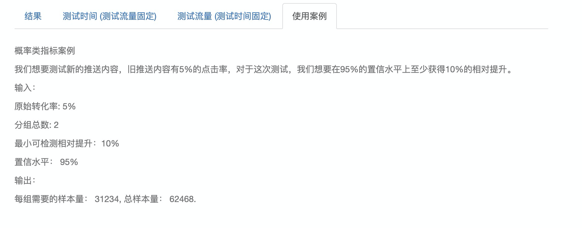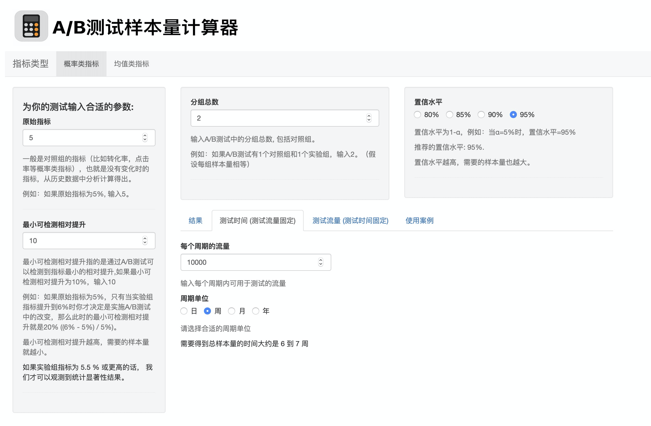 在使用案例这个版块,我会针对概率类指标和均值类指标各举一个例子,来说明具体情况下应该如何输入不同的参数。