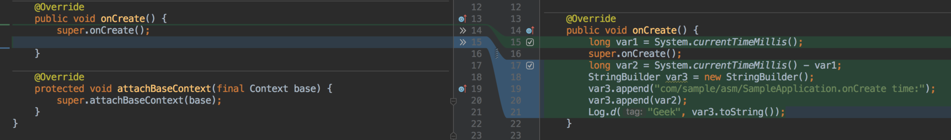 今天我们的第一个练习是:通过ASM实现统计每个方法的耗时。怎么做呢?请你先不要着急,同样以SampleApplication类为例,如下图所示,你可以先手动写一下希望实现插桩前后的对比代码。
