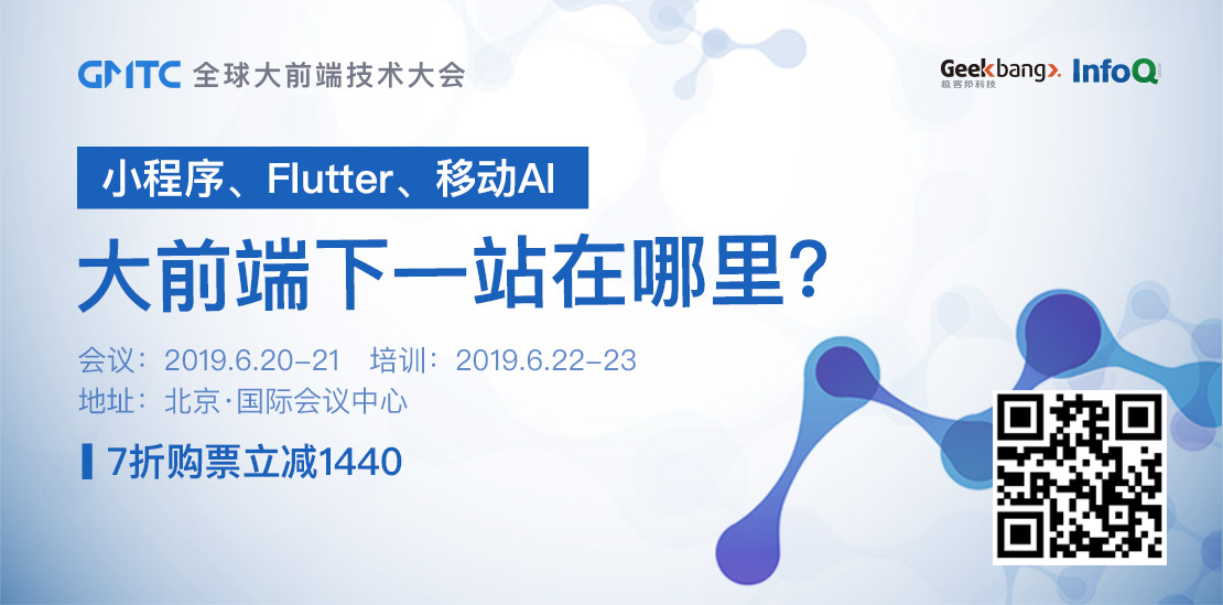 小程序、Flutter、移动AI、工程化、性能优化…大前端的下一站在哪里?GMTC 2019全球大前端技术大会将于6月北京盛大开幕,来自Google、BAT、美团、京东、滴滴等一线前端大牛将与你面对面共话前端那些事,聊聊大前端的最新技术趋势和最佳实践案例。- 目前大会最低价7折购票火热进行中,讲师和议题也持续招募中,点击下方图片了解更多大会详情!