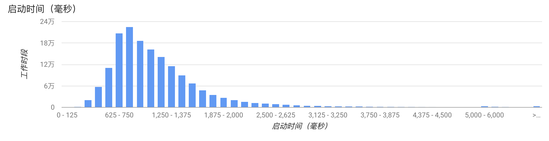 很多应用采用平均启动时间,不过这个指标其实并不太好,一些体验很差的用户很有可能是被平均了。我更建议使用类似下面的指标: