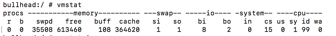vmstat的各个字段说明可以参考《vmstat监视内存使用情况》,其中Memory中的buff和cache,I/O中的bi和bo,System中的cs,以及CPU中的sy和wa,这些字段的数值都与I/O行为有关。