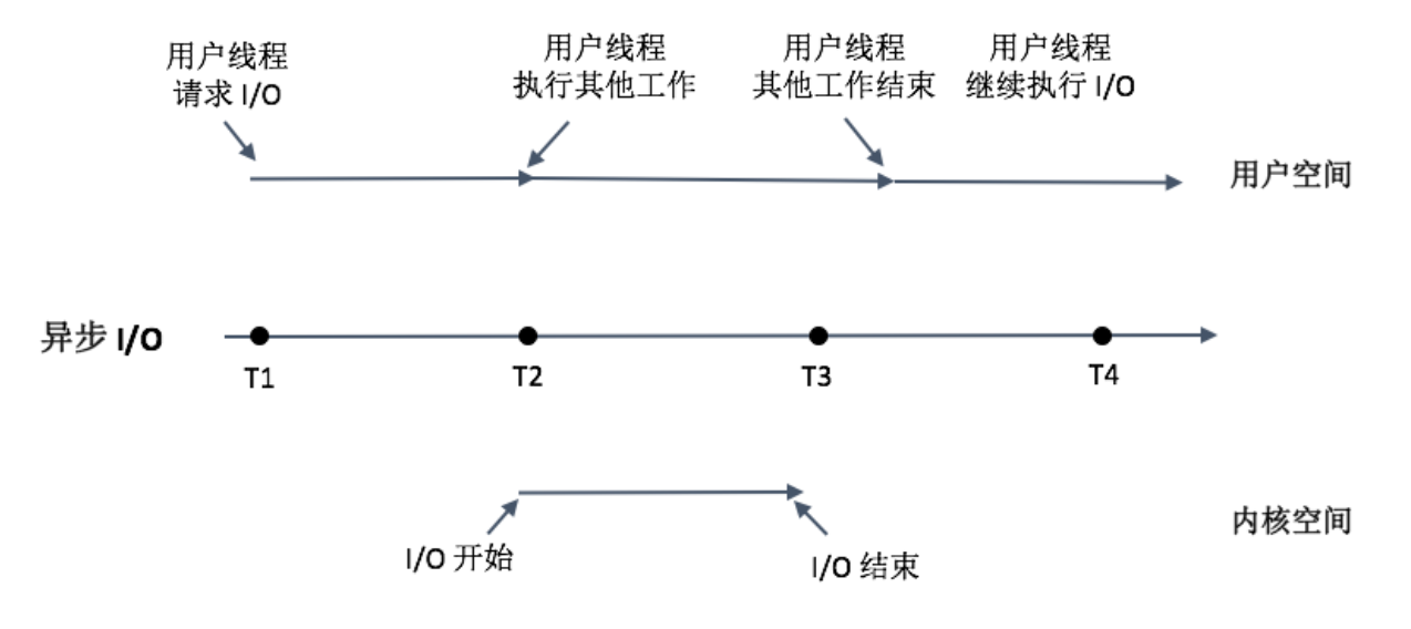 多线程阻塞式I/O会增加系统开销,那我们是否可以使用异步I/O呢?当我们线程遇到I/O操作的时候,不再以阻塞的方式等待I/O操作的完成,而是将I/O请求发送给系统后,继续往下执行。这个过程你可以参考下面的图。