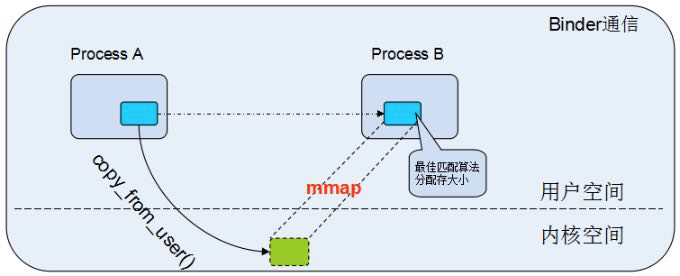 利用mmap,Binder在跨进程通信只需要一次数据拷贝,比传统的Socket、管道等跨进程通信方式会少一次数据拷贝过程。