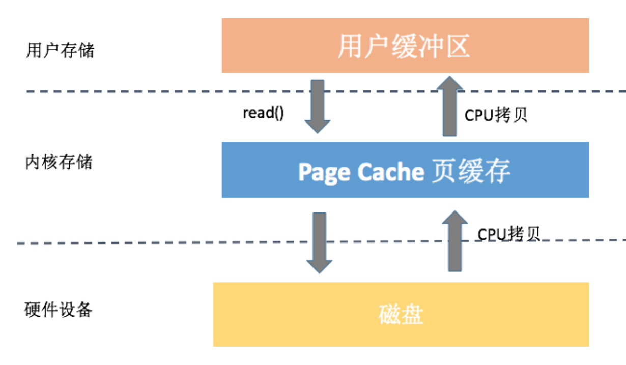 上图中我以read()操作为例,它会导致数据先从磁盘拷贝到Page Cache中,然后再从Page Cache拷贝到应用程序的用户空间,这样就会多一次内存拷贝。系统这样设计主要是因为内存相对磁盘是高速设备,即使多拷贝100次,内存也比真正读一次硬盘要快。