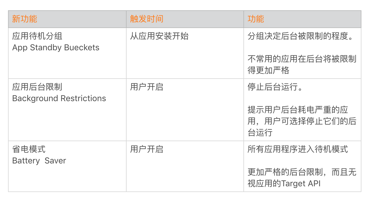 尽管经过几个版本的优化,Android的续航问题依然没有根本性的改善。但你可以看到的是,从Android 9.0开始,Google对电源管理引入了几个更加严格的限制。