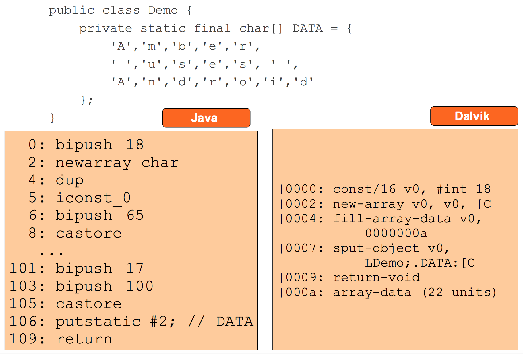 指令优化。Dalvik字节码对大量的指令专门做了精简和优化,如下图所示,相同的代码Java字节码需要100多条,而Dalvik字节码只需要几条。