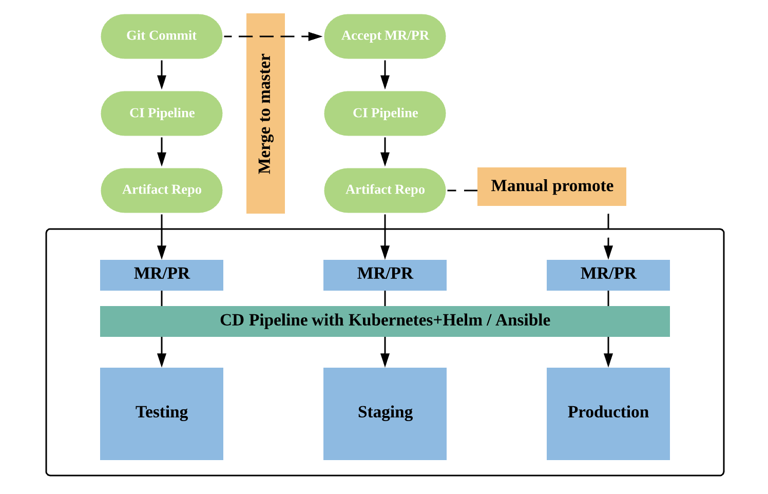 以上面的配置为例,假如生成了应用的1.0版本镜像,接下来,会自动针对测试环境的配置仓库创建一个代码合并请求,变更的内容就是修改镜像名称的版本号为1.0。这个时候,开发或者测试人员可以通过接受合并的方式,将这段环境变更配置合入主干,并再一次自动化地触发部署流水线,将新版本的应用部署到测试环境中。每次应用的部署采用相同的过程,一般就是将最新版本的应用制品拷贝到服务器并且重启,或者更新容器镜像并触发滚动升级。