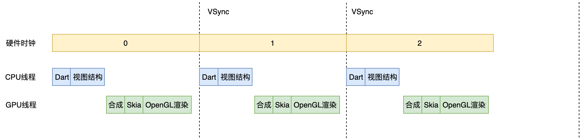 可以看到,Flutter关注如何尽可能快地在两个硬件时钟的VSync信号之间计算并合成视图数据,然后通过Skia交给GPU渲染:UI线程使用Dart来构建视图结构数据,这些数据会在GPU线程进行图层合成,随后交给Skia引擎加工成GPU数据,而这些数据会通过OpenGL最终提供给GPU渲染。