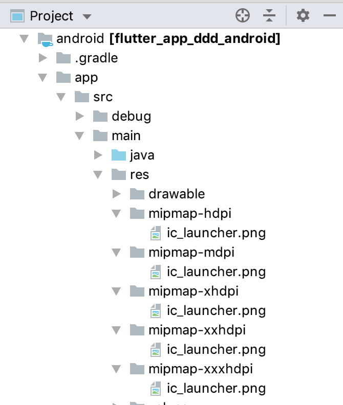 对于Android平台,启动图标位于根目录android/app/src/main/res/mipmap下。我们只需要遵守对应的像素密度标准,保留原始图标名称,将图标更换为目标资源即可: