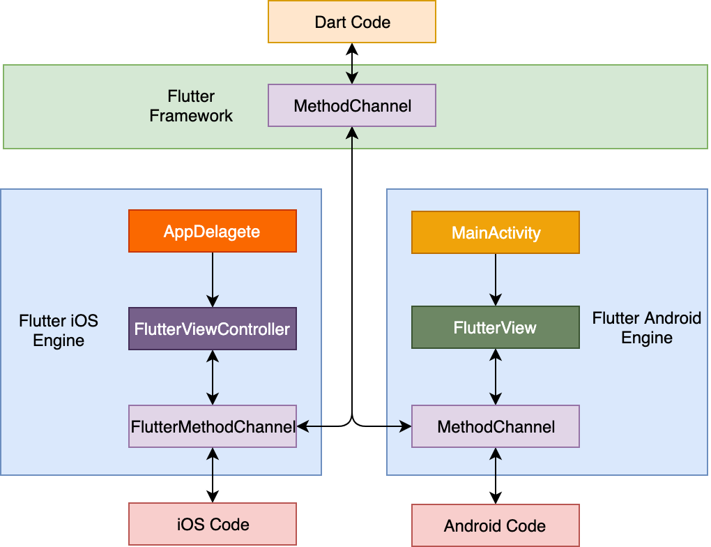 从上图中可以看到,方法调用请求的处理和响应,在Android中是通过FlutterView,而在iOS中则是通过FlutterViewController进行注册的。FlutterView与FlutterViewController为Flutter应用提供了一个画板,使得构建于Skia之上的Flutter通过绘制即可实现整个应用所需的视觉效果。因此,它们不仅是Flutter应用的容器,同时也是Flutter应用的入口,自然也是注册方法调用请求最合适的地方。