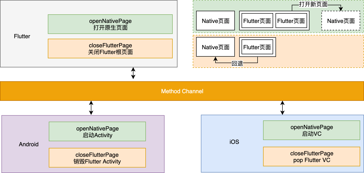 而如果我们想在Flutter页面跳转到原生页面,则需要同时处理好打开新的原生页面,以及关闭自身回退到老的原生页面两种场景。在这两种场景下,我们都需要利用方法通道来注册相应的处理方法,从而在原生代码宿主实现新页面的打开和Flutter容器的关闭。