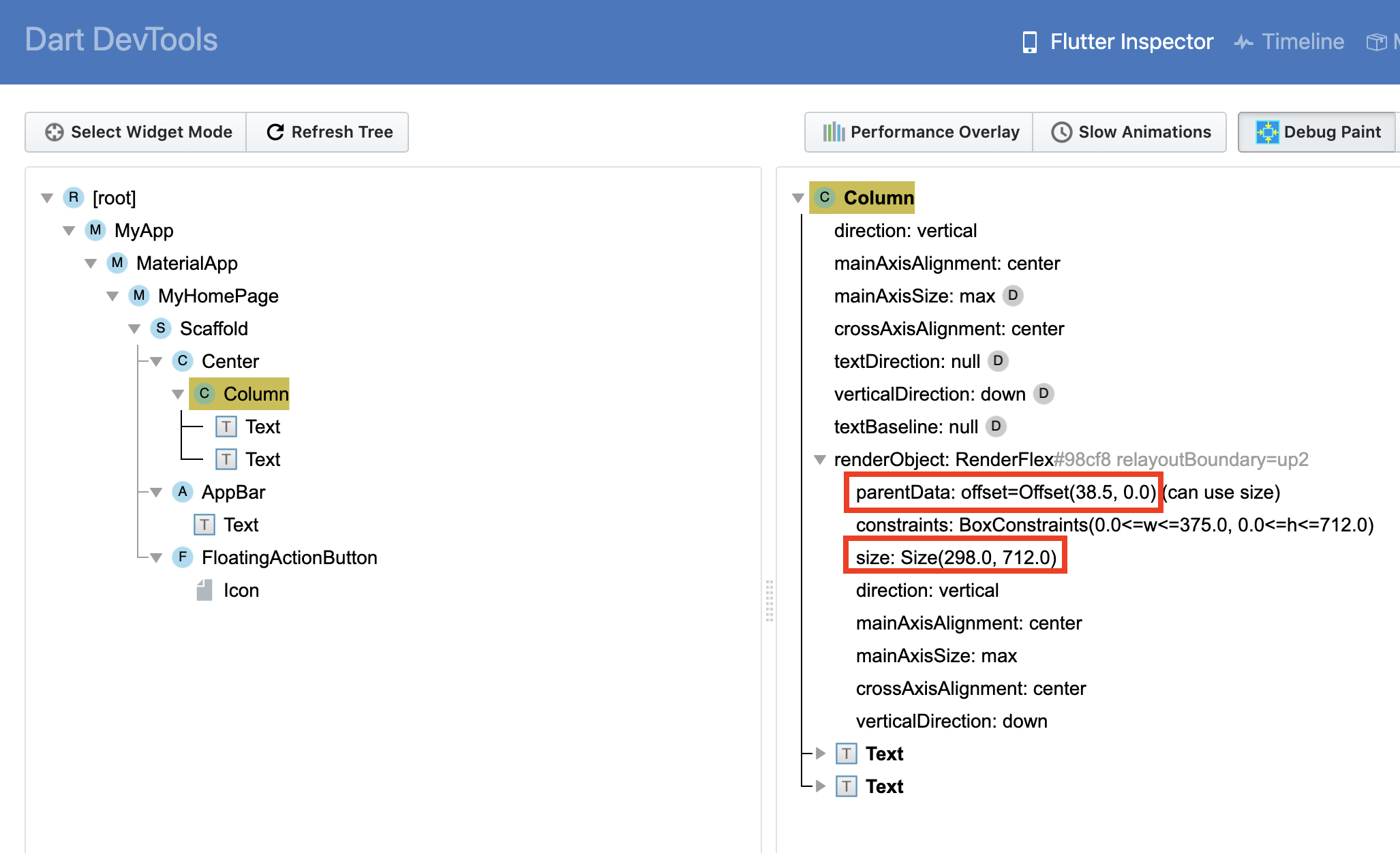 我们的App运行在iPhone X之上,其分辨率为375*812。接下来,我们以Column组件的布局信息为例,通过确认其水平方向为居中布局、垂直方向为充满父Widget剩余空间的过程,来说明Flutter Inspector的具体用法。