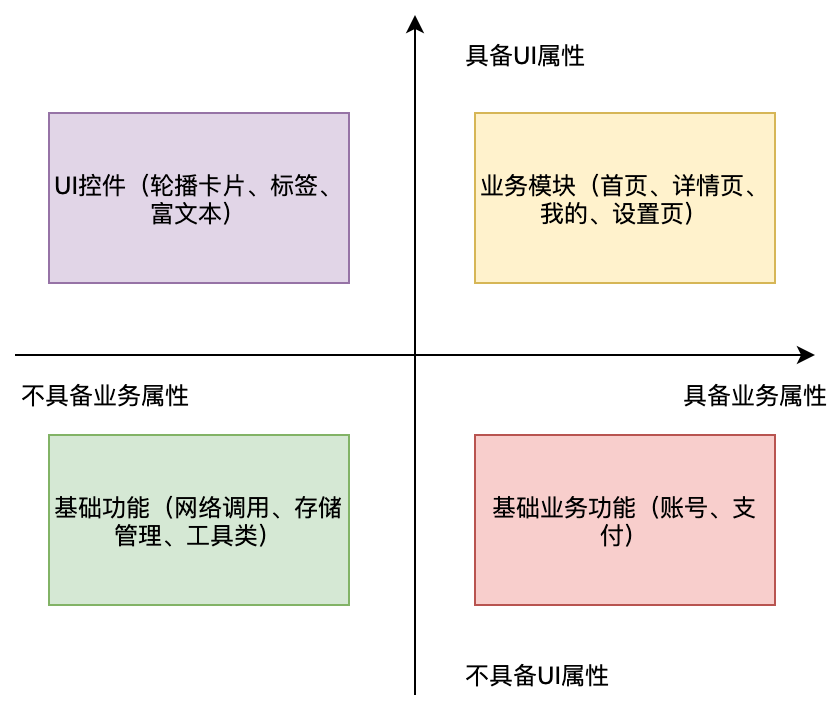 平台化是组件化的升级,即在组件化的基础上,对它们提供的功能进行分类,统一分层划分,增加依赖治理的概念。为了对这些功能单元在概念上进行更为统一的分类,我们按照四象限分析法,把应用程序的组件按照业务和UI分解为4个维度,来分析组件可以分为哪几类。