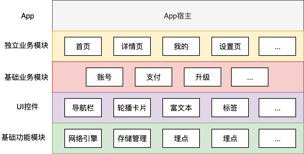按照自身定义,这4类组件其实隐含着分层依赖的关系。比如,处于业务模块中的首页,依赖位于基础业务模块中的账号功能;再比如,位于UI控件模块中的轮播卡片,依赖位于基础功能模块中的存储管理等功能。我们将它们按照依赖的先后顺序从上到下进行划分,就是一个完整的App了。