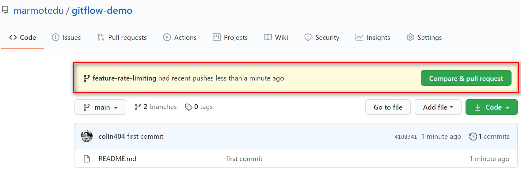 访问https://github.com/marmotedu/gitflow-demo ,点击fork按钮。fork 后的仓库地址为:https://github.com/colin404fork/gitflow-demo 。-