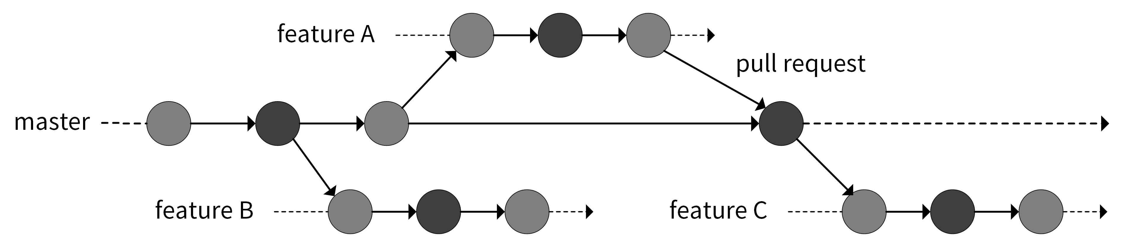 功能分支工作流基于集中式工作流演进而来。在开发新功能时,基于 master 分支新建一个功能分支,在功能分支上进行开发,而不是直接在本地的 master 分支开发,开发完成之后合并到 master 分支,如下图所示: