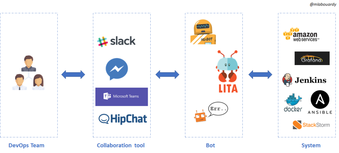 开发/运维/测试人员通过@聊天窗口中的机器人Bot来触发任务,机器人后端会通过API接口调用等方式对接不同的系统,完成不同的任务,例如持续集成、测试、发布等工作。机器人可以是我们自己研发的,也可以是开源的。目前,业界有很多流行的机器人可供选择,常用的有Hubot、Lita、Errbot、StackStorm等。