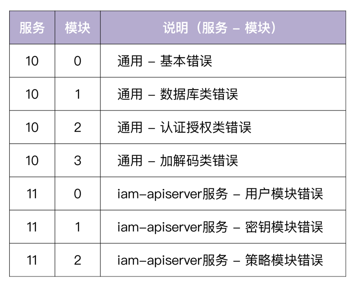 先来看下IAM项目业务的Code码设计规范,具体实现可参考internal/pkg/code目录。IAM项目的错误码设计规范符合上面介绍的错误码设计思路和规范,具体规范见下。