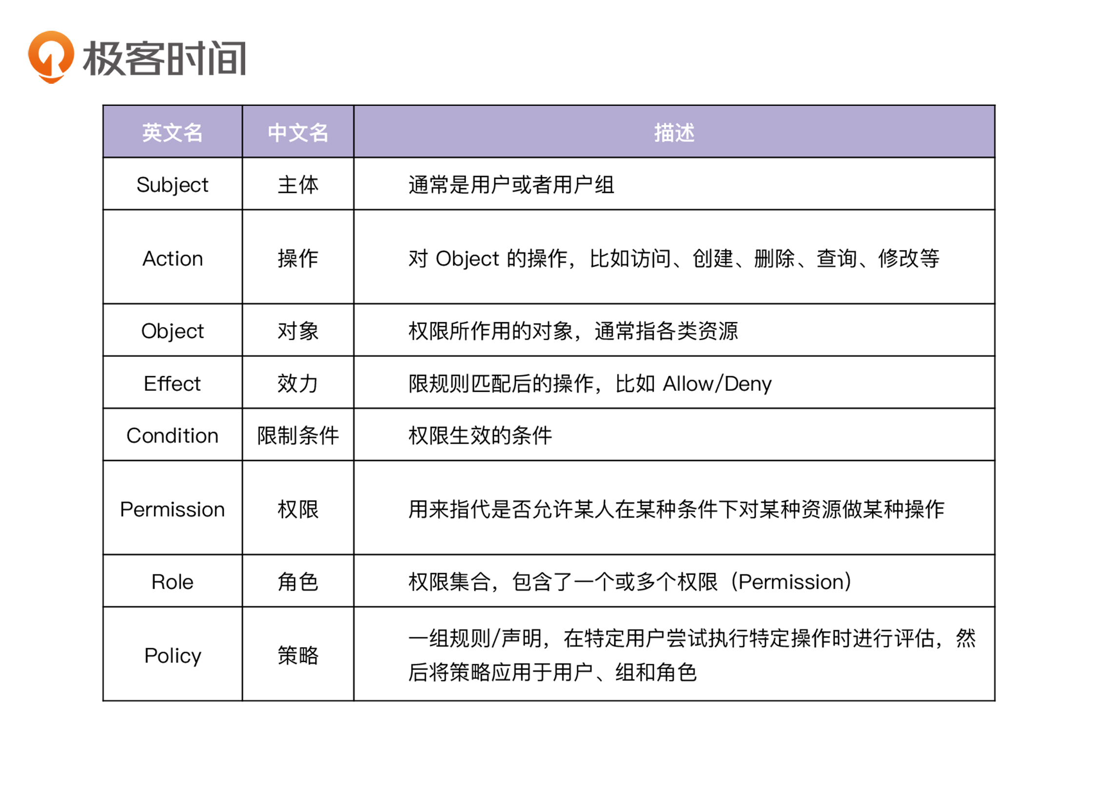 在介绍业界常见的权限模型前,我们先来看下在权限模型中出现的术语。我把常见的术语总结在了下面的表格里: