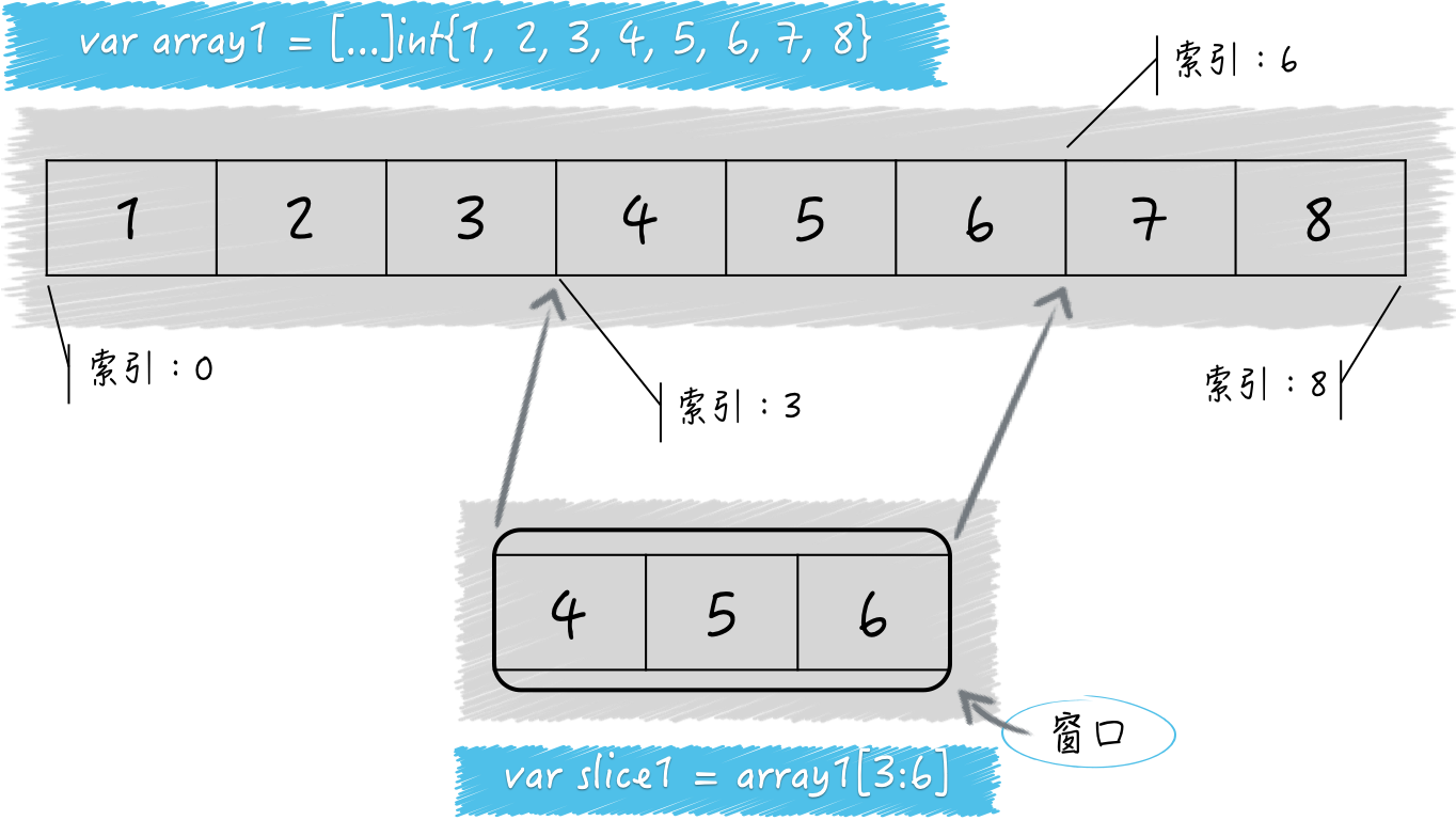 切片代表的窗口也会被划分成一个一个的小格子,就像我们家里的窗户那样。每个小格子都对应着其底层数组中的某一个元素。