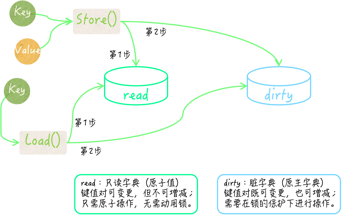 sync.Map在查找指定的键所对应的值的时候,总会先去只读字典中寻找,并不需要锁定互斥锁。只有当确定“只读字典中没有,但脏字典中可能会有这个键”的时候,它才会在锁的保护下去访问脏字典。