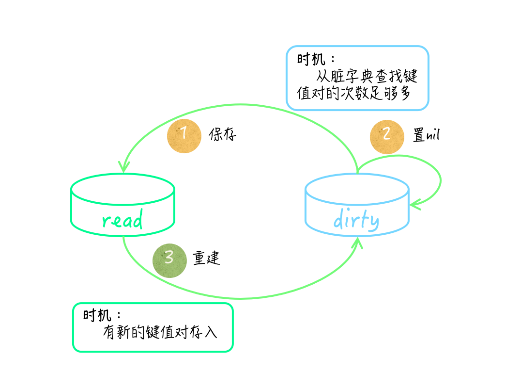 在这之后,一旦再有新的键值对存入,它就会依据只读字典去重建脏字典。这个时候,它会把只读字典中已被逻辑删除的键值对过滤掉。理所当然,这些转换操作肯定都需要在锁的保护下进行。