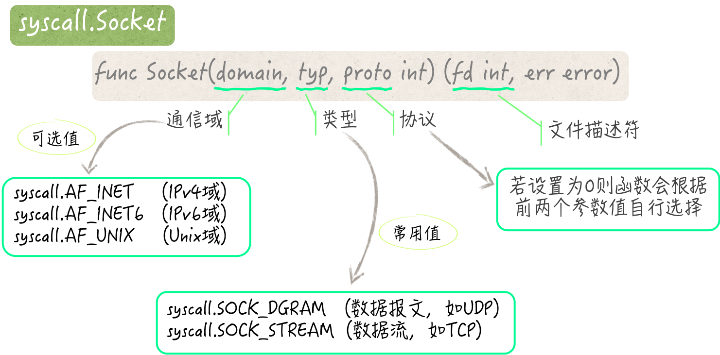 支持socket的操作系统一般都会对外提供一套API。Go语言的syscall代码包中也有与之对应的程序实体。其中最重要的一个就是syscall.Socket函数。
