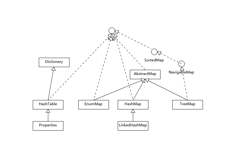 HashMap 等其他 Map 实现则是都扩展了 AbstractMap,里面包含了通用方法抽象。不同 Map 的用途,从类图结构就能体现出来,设计目的已经体现在不同接口上。