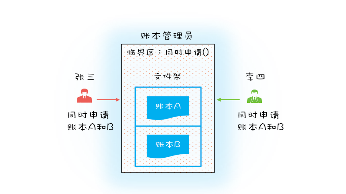 在详细介绍死锁之前,我们先看看现实世界里的一种特殊场景。如果有客户找柜员张三做个转账业务:账户A 转账户B 100元,此时另一个客户找柜员李四也做个转账业务:账户B 转账户A 100 元,于是张三和李四同时都去文件架上拿账本,这时候有可能凑巧张三拿到了账本A,李四拿到了账本B。张三拿到账本A后就等着账本B(账本B已经被李四拿走),而李四拿到账本B后就等着账本A(账本A已经被张三拿走),他们要等多久呢?他们会永远等待下去…因为张三不会把账本A送回去,李四也不会把账本B送回去。我们姑且称为死等吧。