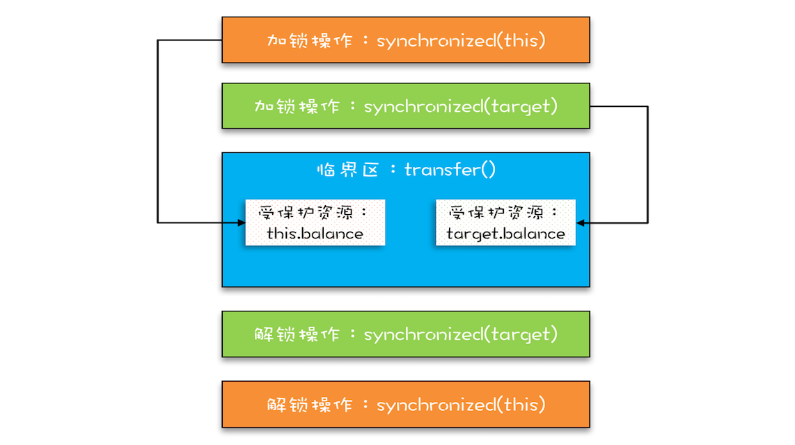 破坏这个条件,需要对资源进行排序,然后按序申请资源。这个实现非常简单,我们假设每个账户都有不同的属性 id,这个 id 可以作为排序字段,申请的时候,我们可以按照从小到大的顺序来申请。比如下面代码中,①~⑥处的代码对转出账户(this)和转入账户(target)排序,然后按照序号从小到大的顺序锁定账户。这样就不存在“循环”等待了。