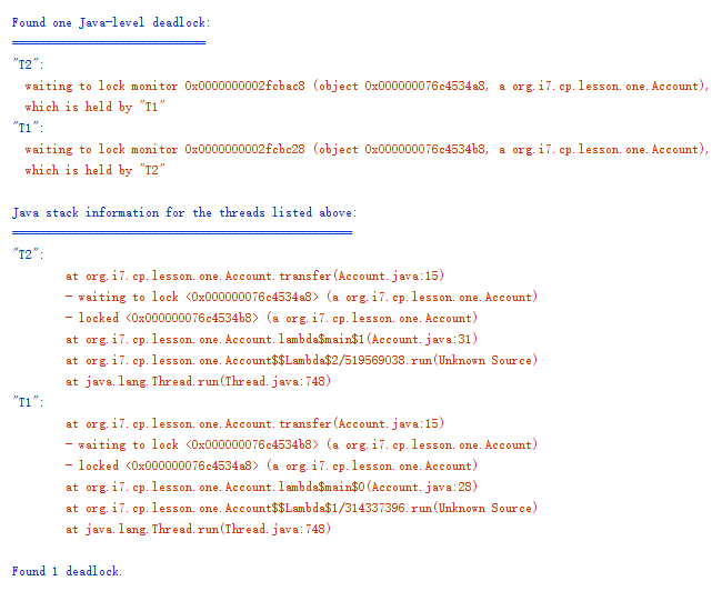 你可以通过 jstack 命令或者Java VisualVM这个可视化工具将JVM所有的线程栈信息导出来,完整的线程栈信息不仅包括线程的当前状态、调用栈,还包括了锁的信息。例如,我曾经写过一个死锁的程序,导出的线程栈明确告诉我发生了死锁,并且将死锁线程的调用栈信息清晰地显示出来了(如下图)。导出线程栈,分析线程状态是诊断并发问题的一个重要工具。