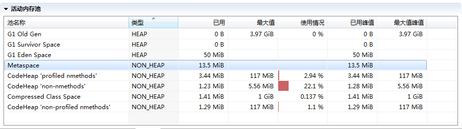 在JMC或JConsole的内存管理界面,会统计部分非堆内存,但提供的信息相对有限,下图就是JMC活动内存池的截图。-