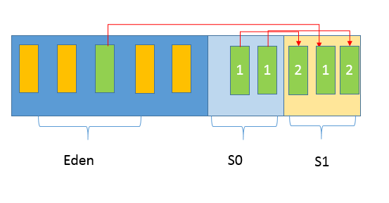 第一,Java应用不断创建对象,通常都是分配在Eden区域,当其空间占用达到一定阈值时,触发minor GC。仍然被引用的对象(绿色方块)存活下来,被复制到JVM选择的Survivor区域,而没有被引用的对象(黄色方块)则被回收。注意,我给存活对象标记了“数字1”,这是为了表明对象的存活时间。-