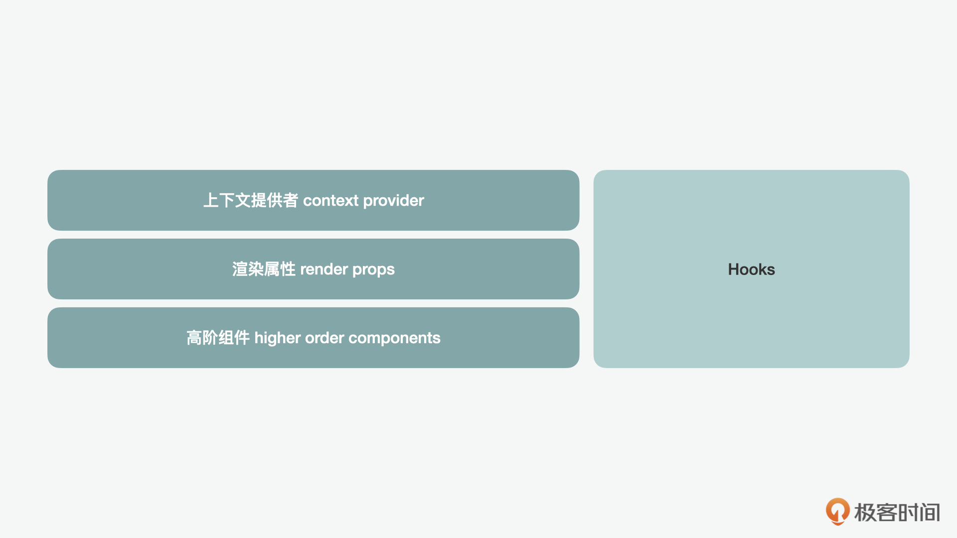 接下来我们就来讲讲几种在React中会用到的组件化的模式。这里我们首先需要注意的是,在React中的组件化和我们通常了解的Web Component是有区别的。我们在说到Web Component的时候,更多关注的是组件的封装和重用,也就是经典的面向对象的设计模式思想。而React Component更多关注的是,通过声明式的方式更好地让DOM和状态数据之间同步。为了更好地实现组件化,React推出了一些不同的模式,这里比较重要的就包含了上下文提供者、渲染属性、高阶组件和后来出现的Hooks。