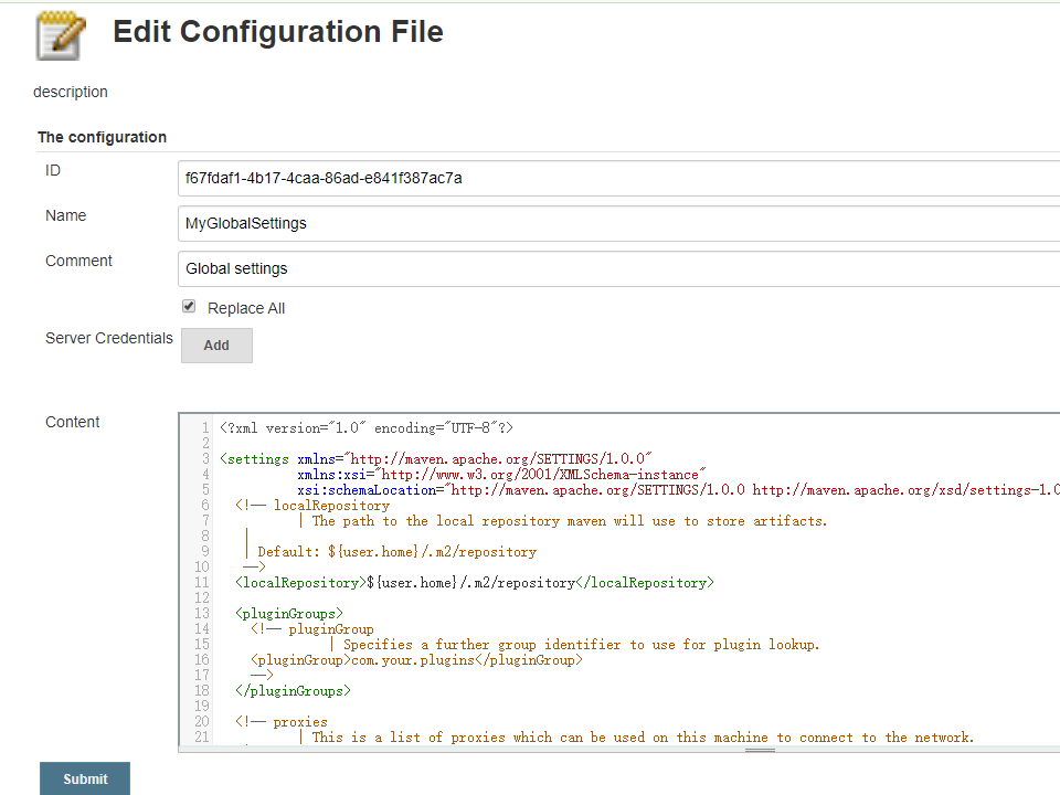 点击”系统管理—>Managed files—>Add a new Config—>Global Maven settings.xml“,将上面setting.xml文件的内容放到”Content”对应的输入框里,如下所示: