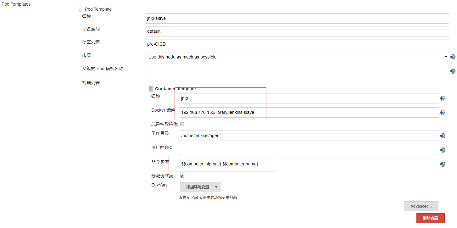 1、 如果name参数配置的值为jnlp,就表示使用基于Jnlp方式的jnlp-agent自启动连接Jenkins master。这就需要保证image参数指定的镜像里包含启动jnlp-agent的命令(官方提供的镜像启动命令为jenkins-slave(旧版本)或者jenkins-agent(新版本))命令,同时需要指定启动参数${computer.jnlpmac} ${computer.name;如果指定的镜像里没有这些命令,或者没有启动参数,动态pod就会创建失败。