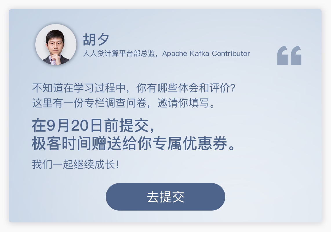 你好,我是胡夕。今天,我的专栏“Kafka核心技术与实战”就正式结束了。