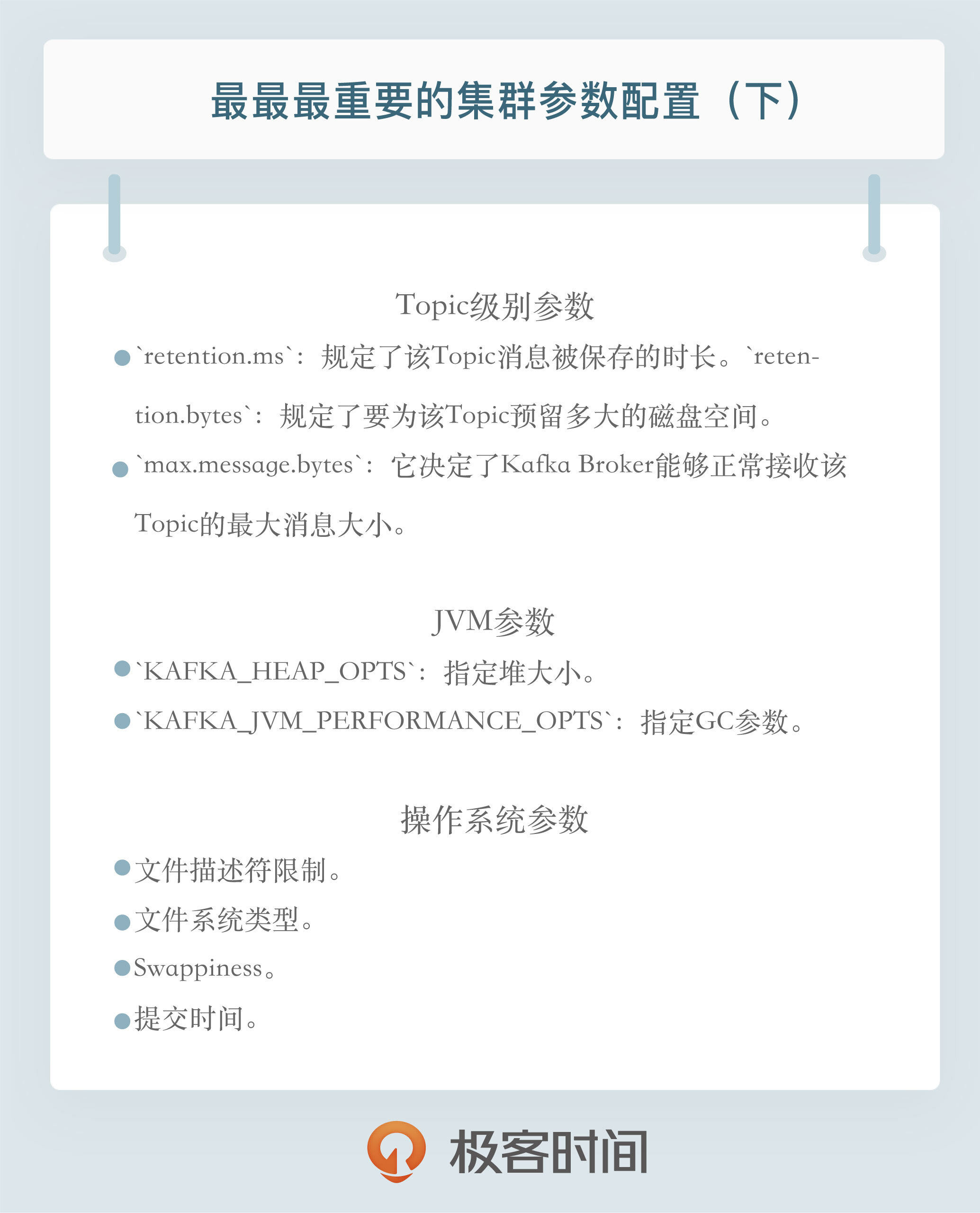 今天我和你分享了关于Kafka集群设置的各类配置,包括Topic级别参数、JVM参数以及操作系统参数,连同上一篇一起构成了完整的Kafka参数配置列表。我希望这些最佳实践能够在你搭建Kafka集群时助你一臂之力,但切记配置因环境而异,一定要结合自身业务需要以及具体的测试来验证它们的有效性。