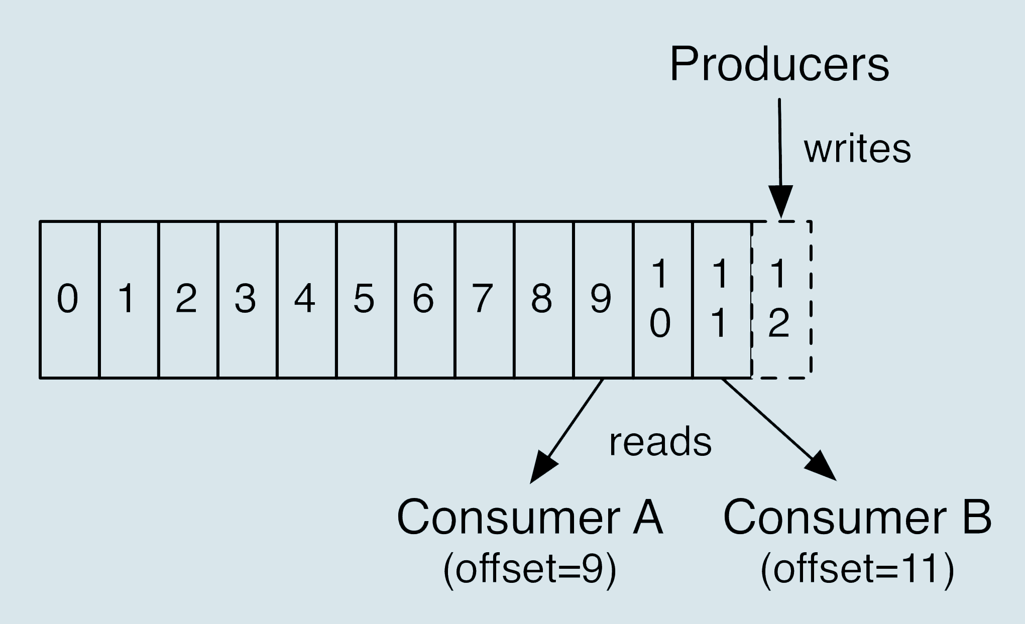 比如对于Consumer A而言,它当前的位移值就是9;Consumer B的位移值是11。