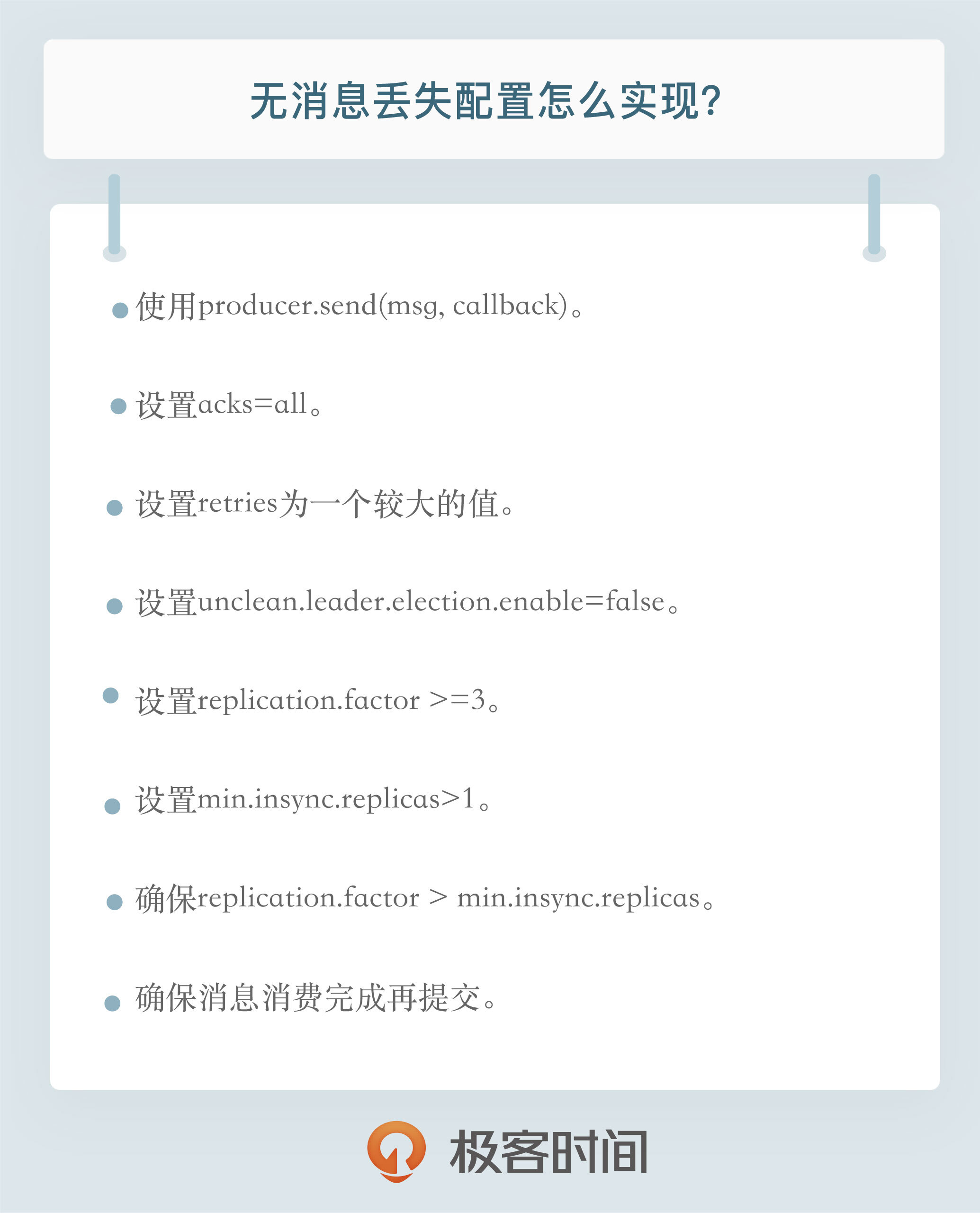看完这两个案例之后,我来分享一下Kafka无消息丢失的配置,每一个其实都能对应上面提到的问题。