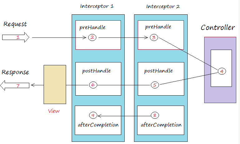 如果你用过Spring Interceptor或是Apache Flume,那么应该不会对拦截器这个概念感到陌生,其基本思想就是允许应用程序在不修改逻辑的情况下,动态地实现一组可插拔的事件处理逻辑链。它能够在主业务操作的前后多个时间点上插入对应的“拦截”逻辑。下面这张图展示了Spring MVC拦截器的工作原理: