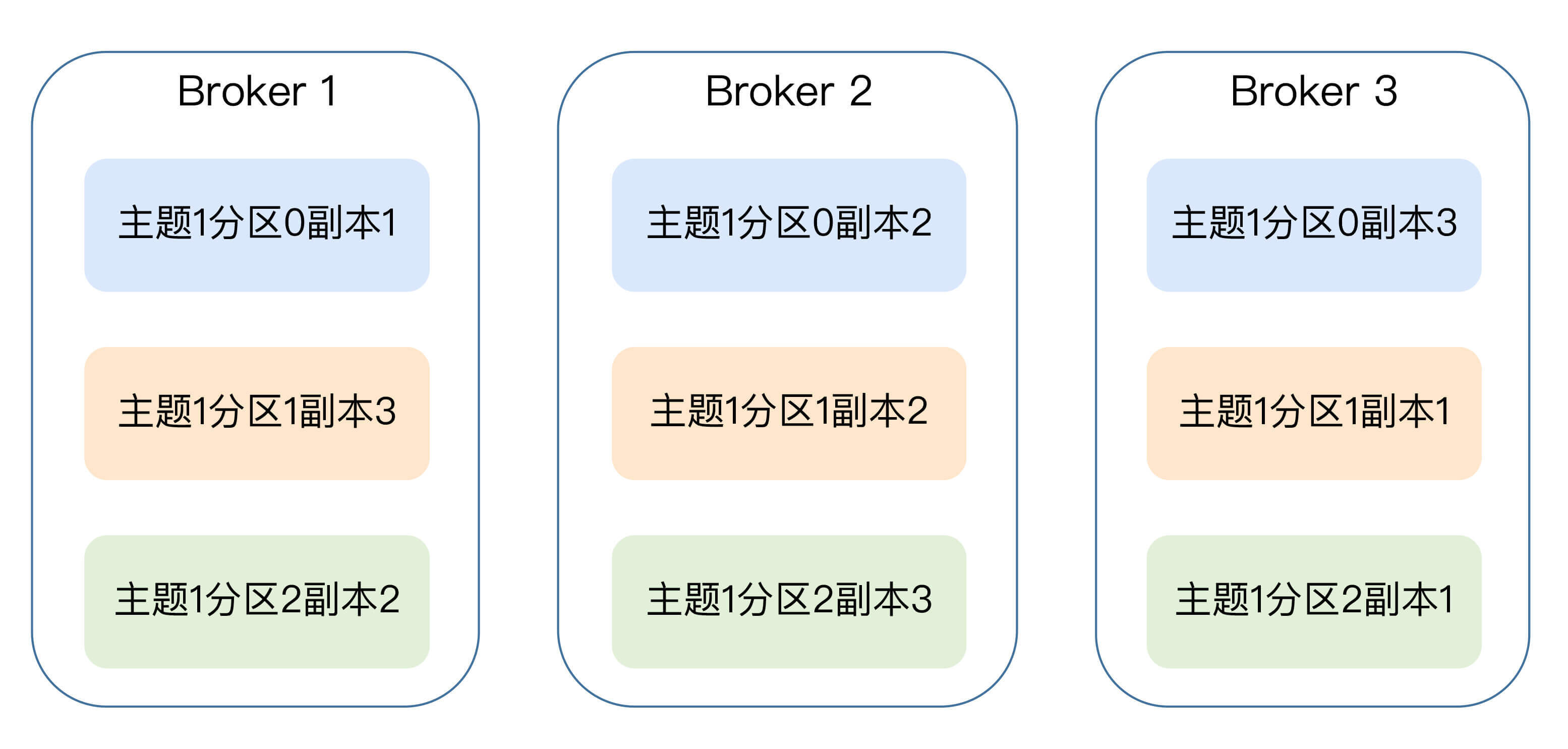 接下来我们来看一张图,它展示的是一个有3台Broker的Kafka集群上的副本分布情况。从这张图中,我们可以看到,主题1分区0的3个副本分散在3台Broker上,其他主题分区的副本也都散落在不同的Broker上,从而实现数据冗余。