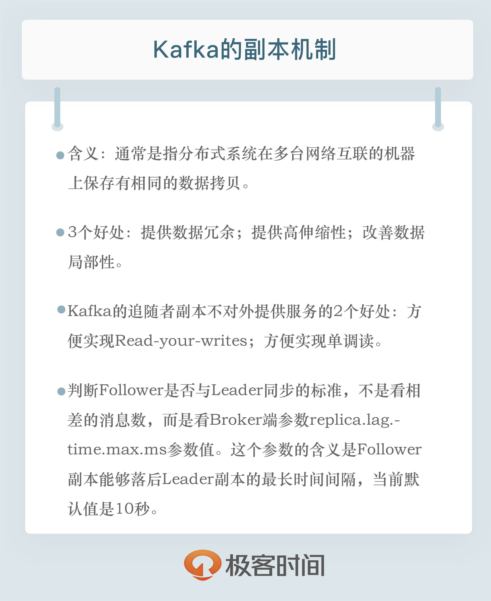 今天,我主要跟你分享了Apache Kafka的副本机制以及它们实现的原理。坦率地说,我觉得有些地方可能讲浅了,如果要百分之百地了解Replication,你还是要熟读一下Kafka相应的源代码。不过你也不用担心,在专栏后面的内容中,我会专门从源码角度分析副本机制,特别是Follower副本从Leader副本拉取消息的全过程。从技术深度上来说,那一讲应该算是本专栏中最贴近技术内幕的分析了,你一定不要错过。