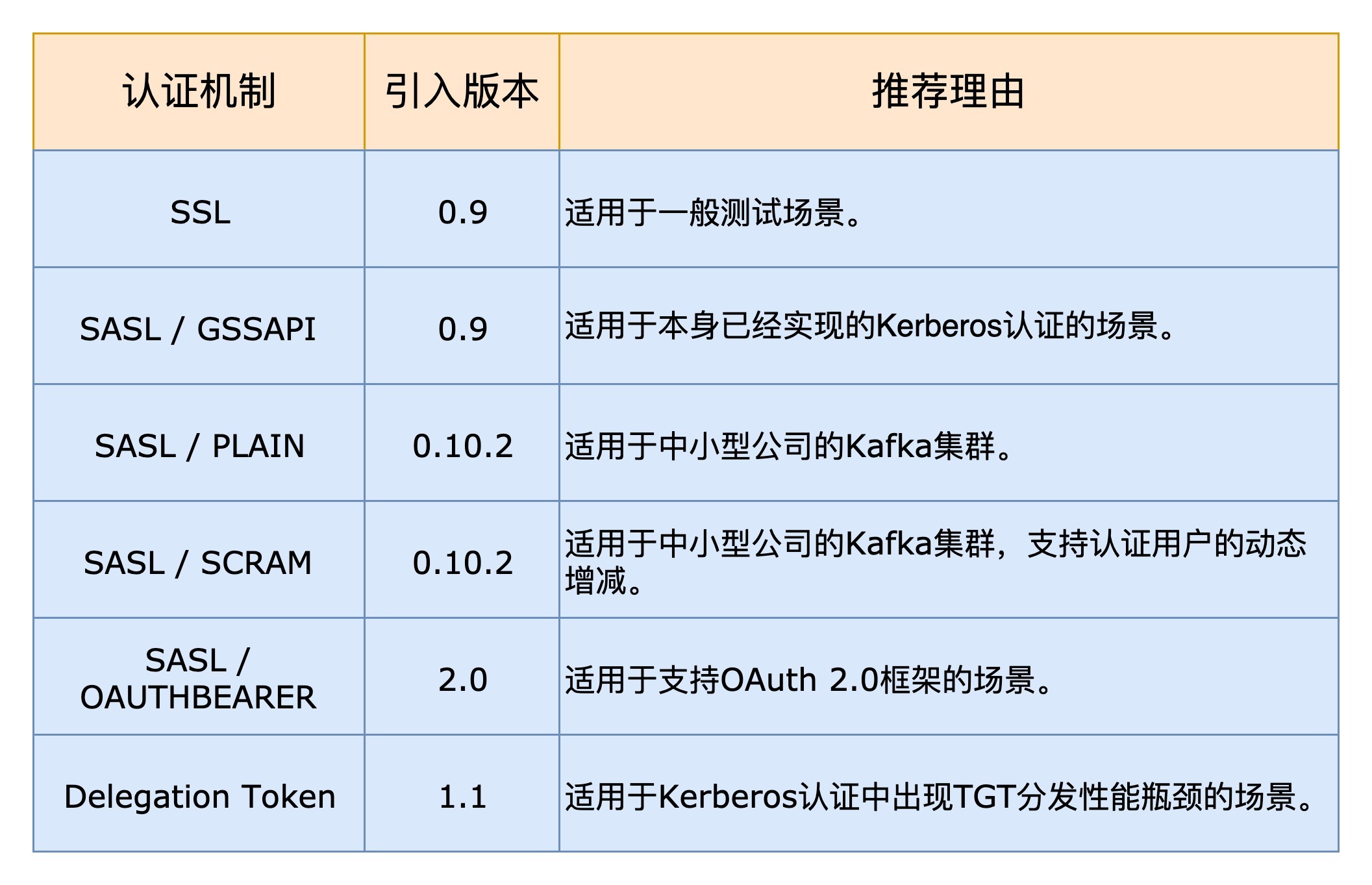Kafka为我们提供了这么多种认证机制,在实际使用过程中,我们应该如何选择合适的认证框架呢?下面我们就来比较一下。
