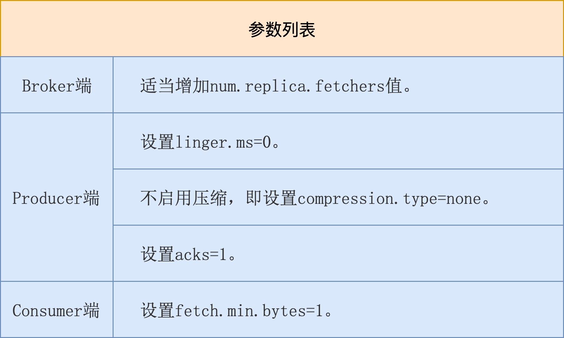 在Producer端,我们希望消息尽快地被发送出去,因此不要有过多停留,所以必须设置linger.ms=0,同时不要启用压缩。因为压缩操作本身要消耗CPU时间,会增加消息发送的延时。另外,最好不要设置acks=all。我们刚刚在前面说过,Follower副本同步往往是降低Producer端吞吐量和增加延时的首要原因。