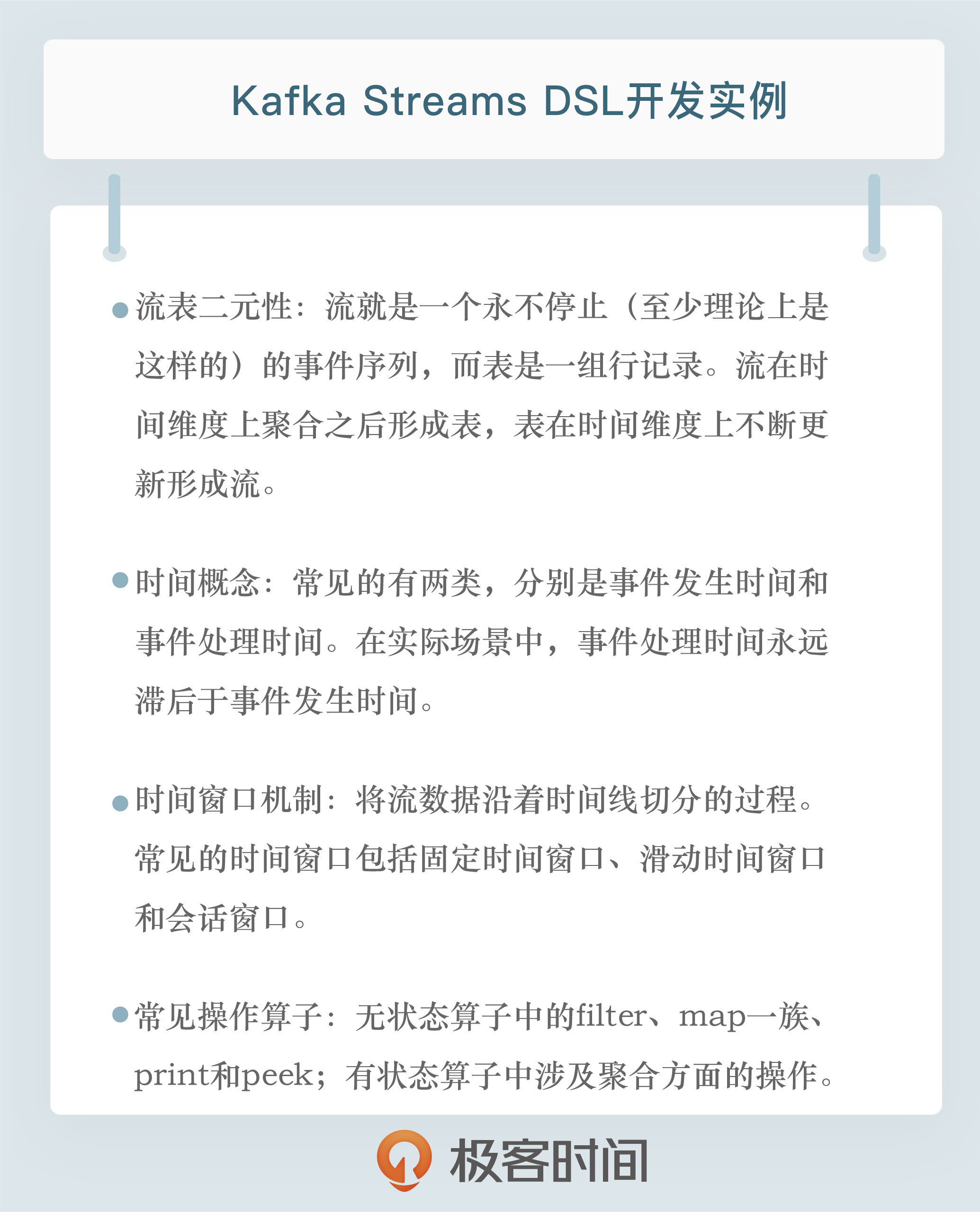 好了,我们来小结一下。今天我跟你分享了Kafka Streams以及DSL的背景与概念,然后我根据实例展示了WordCount单词计数程序以及运行方法,最后,针对常见的操作算子和时间窗口,我给出了示例代码,这些内容应该可以帮你应对大部分的流处理开发。另外,我建议你经常性地查询一下官网文档,去学习一些更深入更高级的用法,比如固定时间窗口的用法。在很多场景中,我们都想知道过去一段时间内企业某个关键指标的值是多少,如果要实现这个需求,时间窗口是必然要涉及到的。