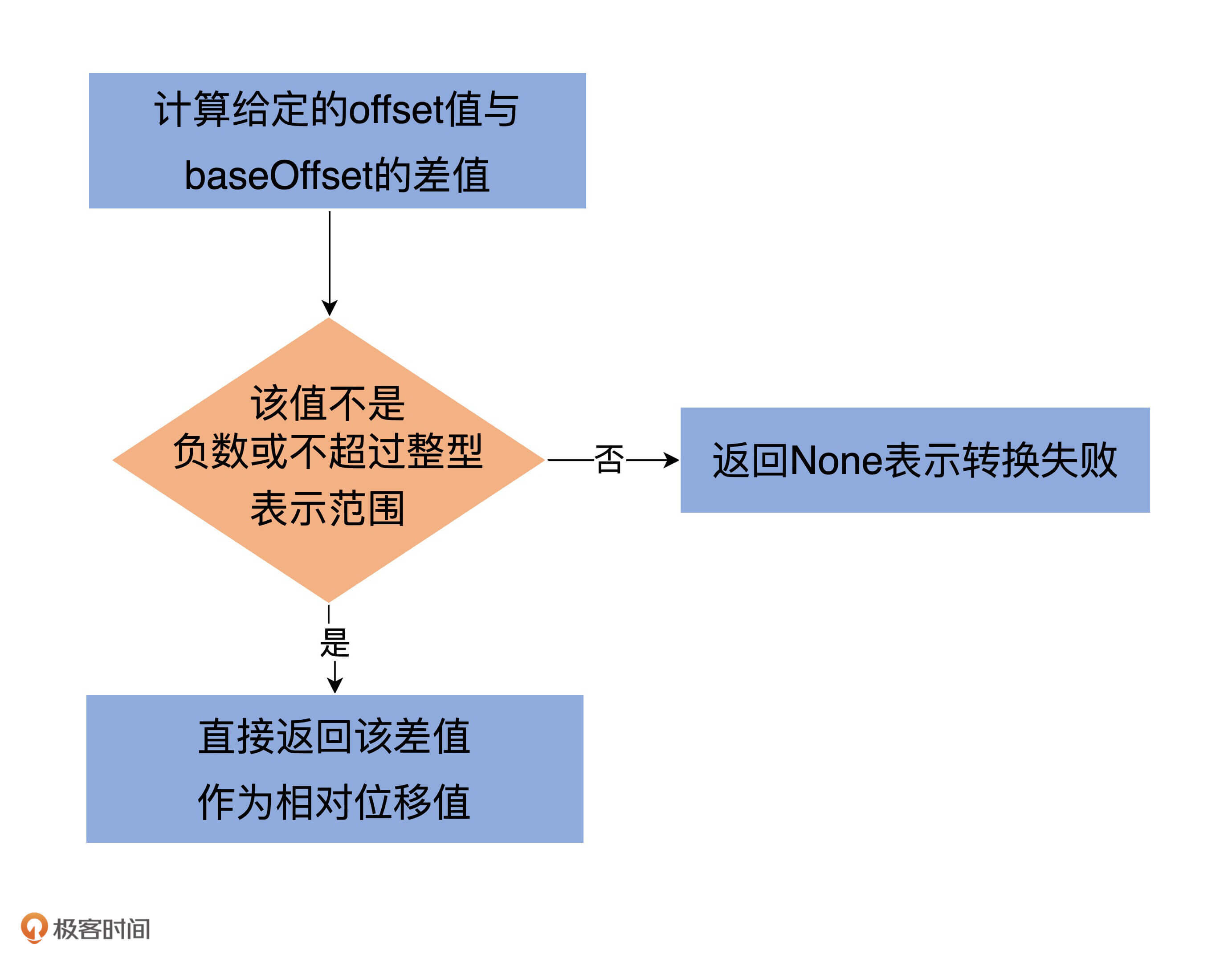 逻辑很简单:第一步是计算给定的offset值与baseOffset的差值;第二步是校验该差值不能是负数或不能超过整型表示范围。如果校验通过,就直接返回该差值作为相对位移值,否则就返回None表示转换失败。