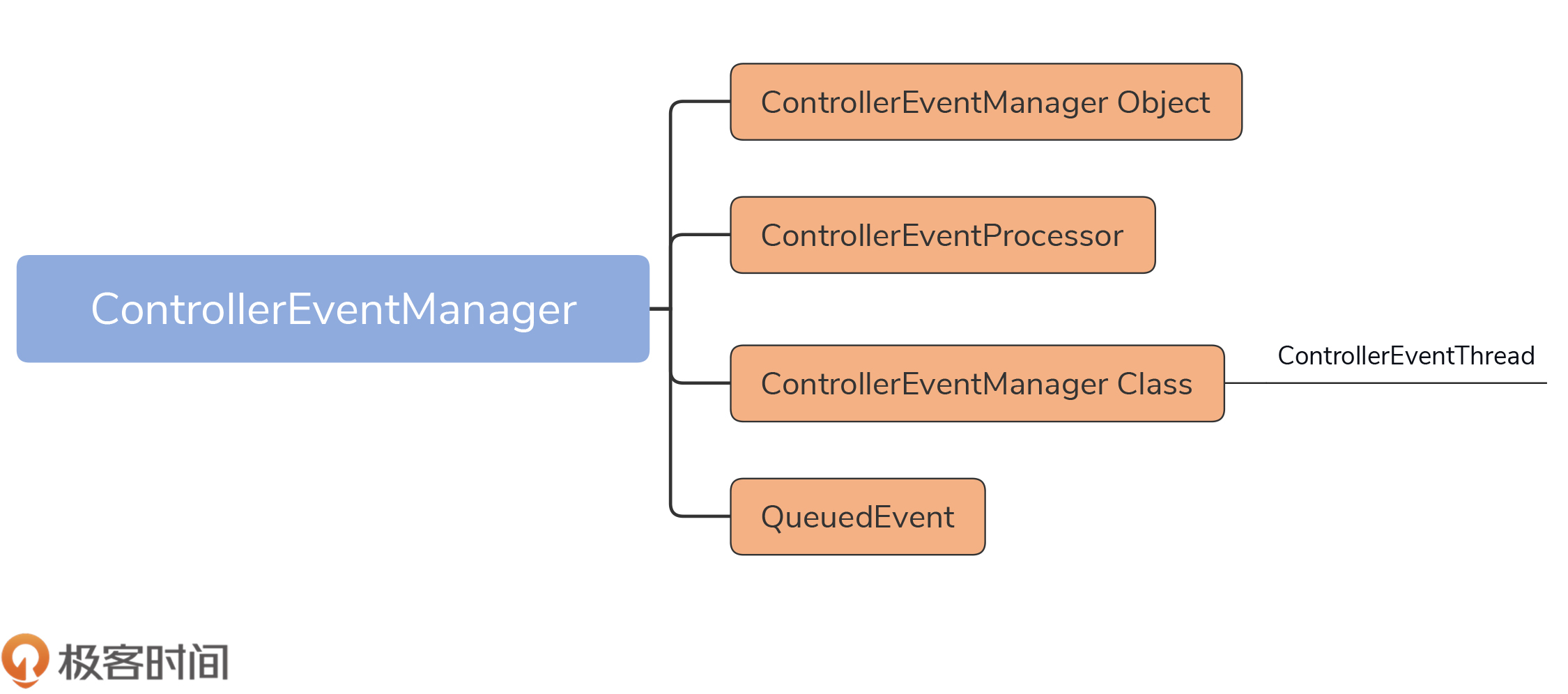 ControllerEventManager对象仅仅定义了3个公共变量,没有任何逻辑,你简单看下就行。至于ControllerEventProcessor接口,我们刚刚已经学习过了。接下来,我们重点学习后面这两个类。