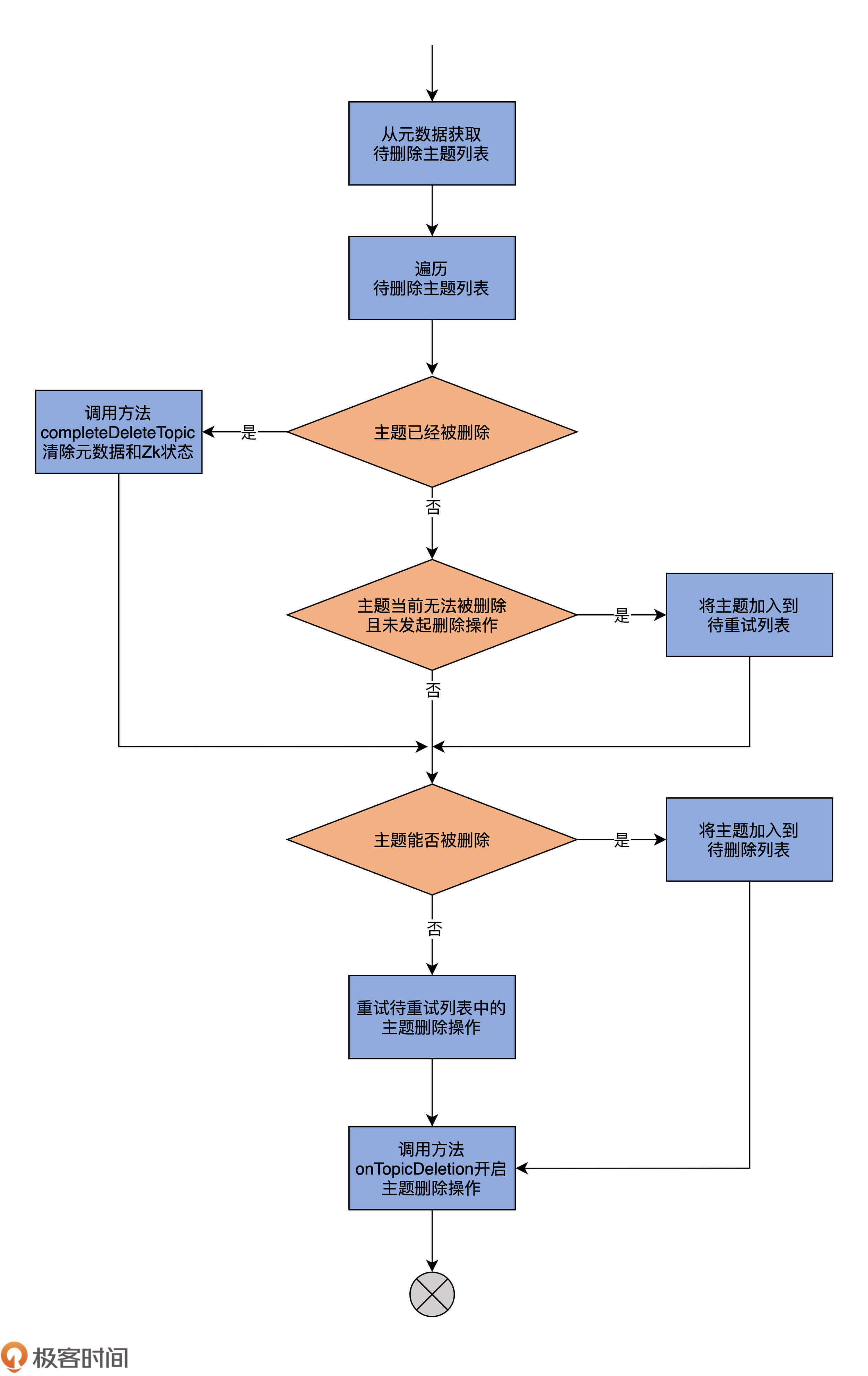 我在代码中用注释的方式,已经把onTopicDeletion方法的逻辑解释清楚了。你可以发现,这个方法也基本是串行化的流程,没什么难理解的。我再给你梳理下其中的核心点。